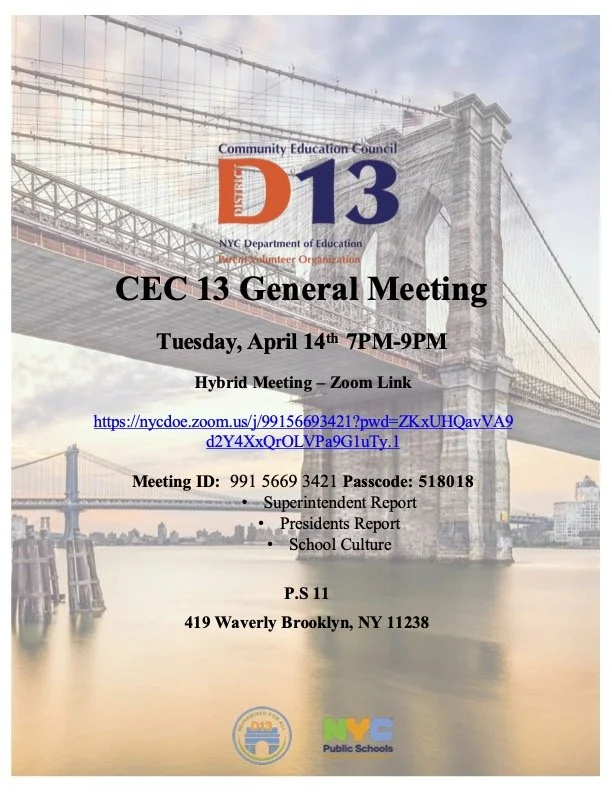 We are District 13’s voice to the DOE - advocating for our schools, striving for equity for all our children and celebrating the diversity and success of our community.
